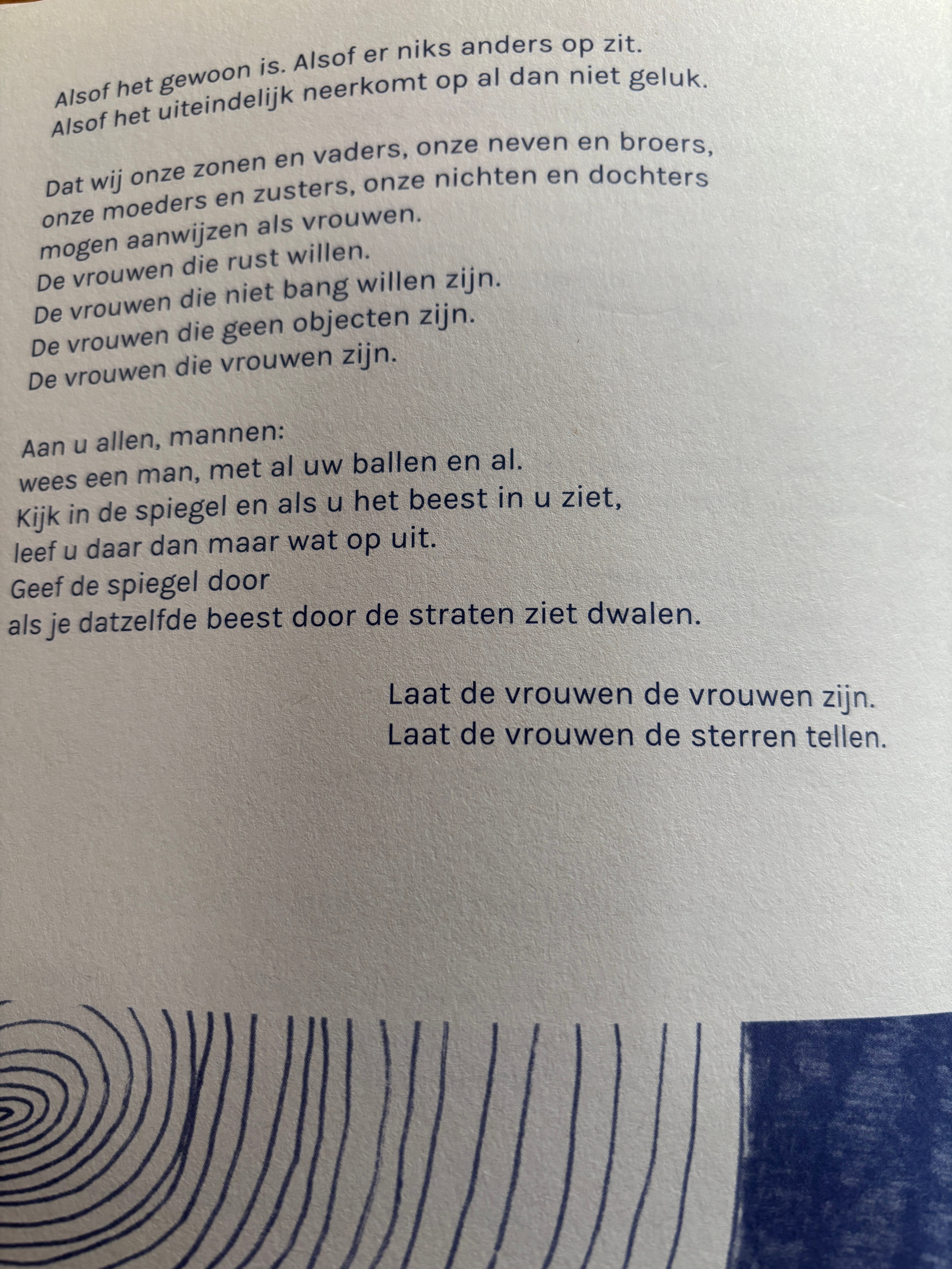 ik wens mannen wat meer ruimte voor tristesse, en vrouwen voor woede, zodat we allemaal volwaardig mens kunnen zijn, in plaats van de bordkartonnen stereotypjes die verwacht worden van ‘een echte man’ en ‘een echte vrouw’.