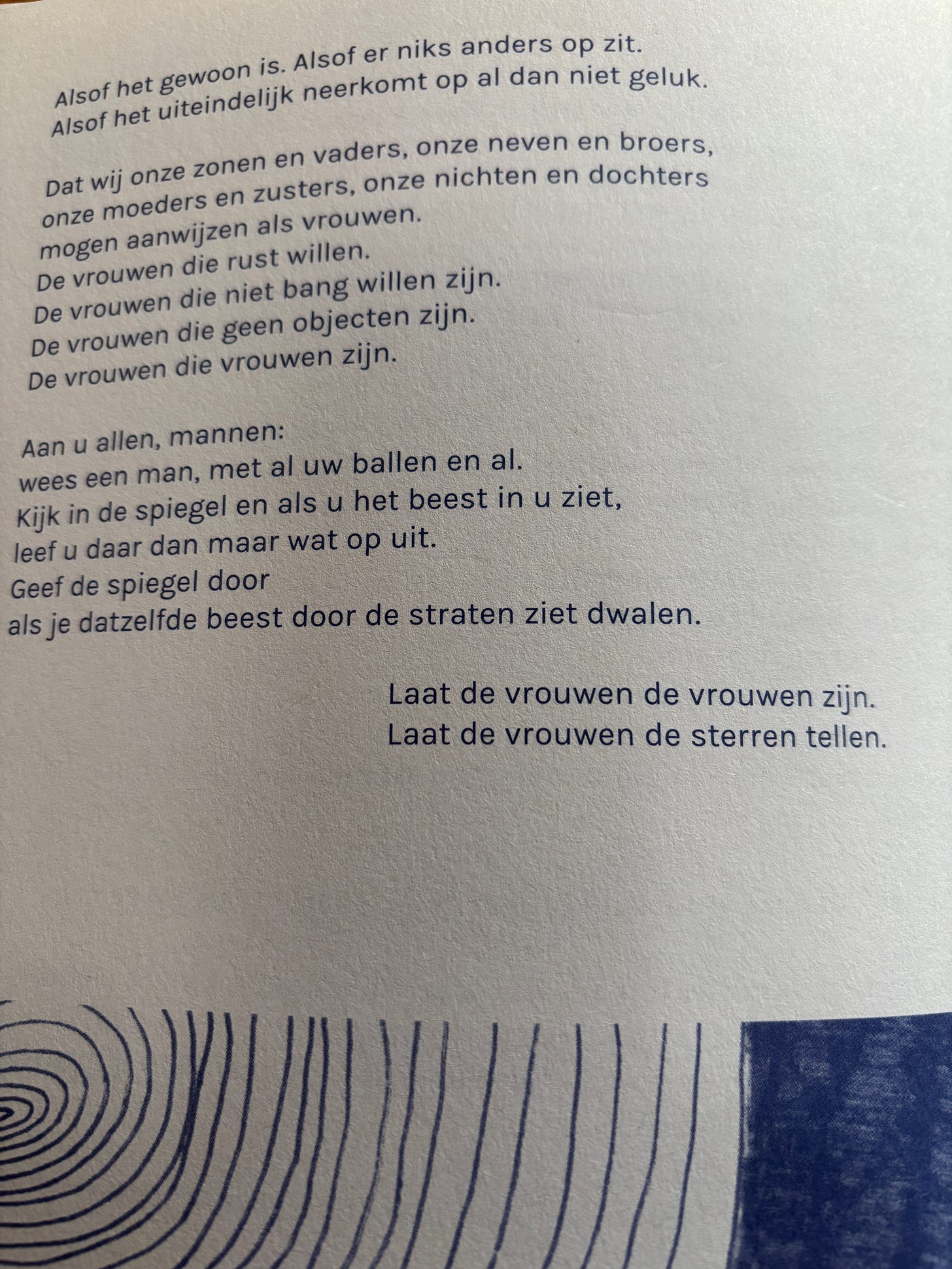 Deze wereld staat op een enorm kantelpunt. De manosphere, het compleet verwrongen mensbeeld in bepaalde regio’s. Het is bijna niet meer bij te houden. Maar als we het er toch over willen hebben, dan denk ik dat de enige oplossing ligt in de niet mis te verstane boodschap van dit gedicht van Kae Tempest :