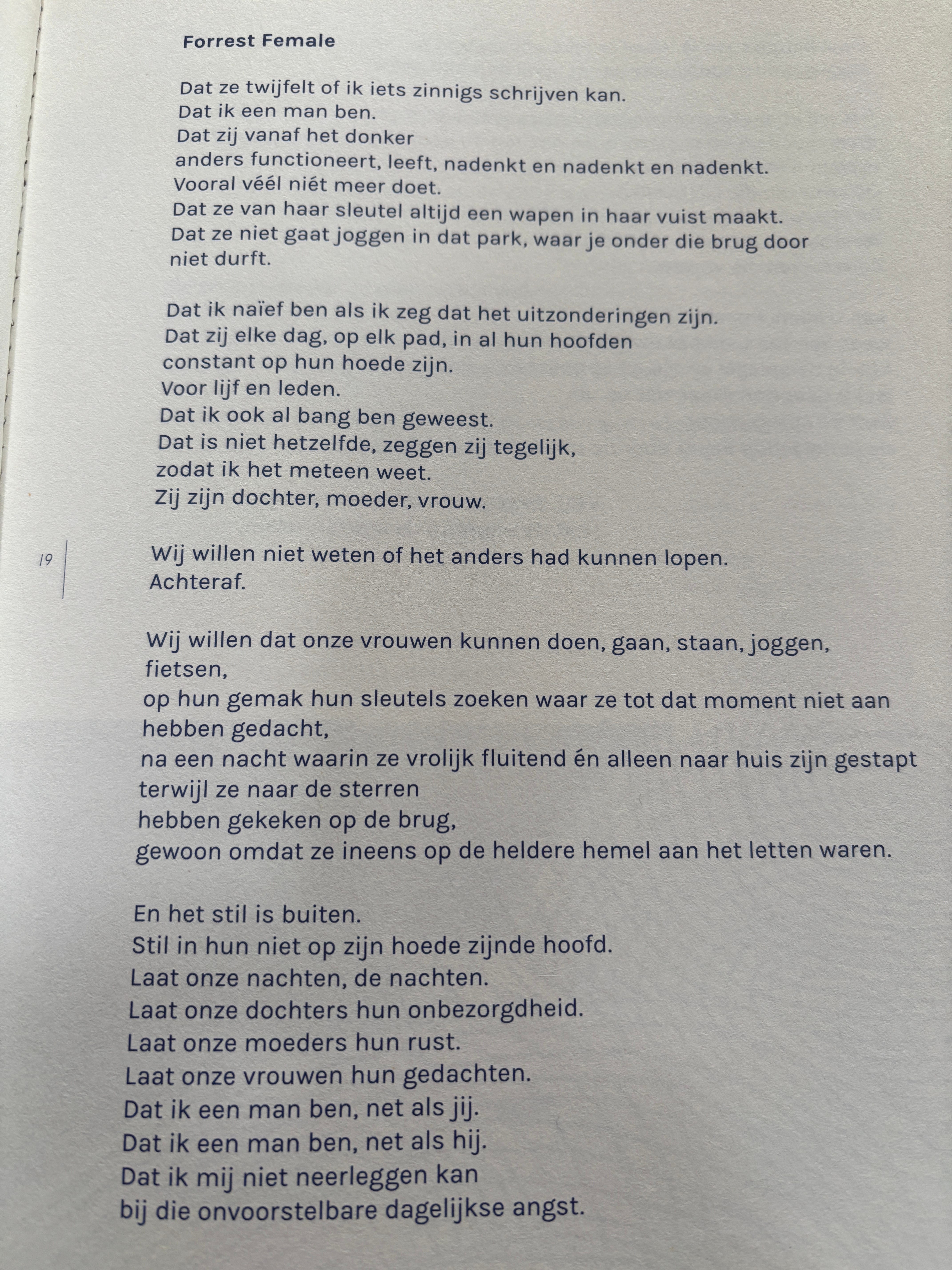In 2019 was Astrid Haerens het beu. Ze schreef een gedicht, het werd vertaald in het Frans. We hebben het op één en dezelfde nacht over het ganse land verdeeld. Astrid kwam op het journaal en deed haar verhaal. Net als Lotte Dodion deed Astrid haar verhaal heel rustig. Maar met een blik in de ogen die niets aan de verbeelding over liet. Namelijk : STOP. Genoeg is genoeg. Lotte heeft het heel duidelijk over mensen. Omdat ze ook toen al inzag dat het niet enkel over vrouwen gaat. Het gaat evengoed over mannen, van welke geaardheid dan ook die zich onveilig voelen, die bang zijn.